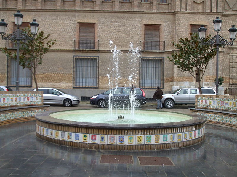 A un lado una gran palmera y varios árboles jóvenes. Frente al Ayuntamiento, y ocupando la mitad de la plaza, se sitúa el Palacio del Marqués de Villafranca de Ebro